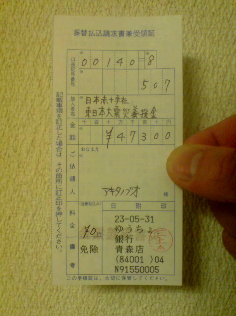 (5/4と5/29のCD、チケット売り上げ合計金額を日本赤十字社へお送りいたしました。)