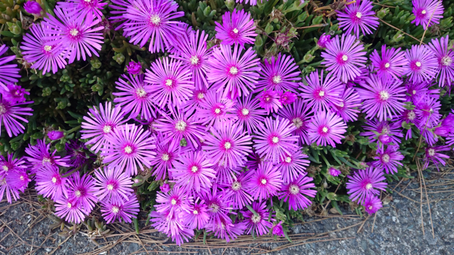 道ばたの植え込み。たくさんに見つめられ思わずぱちり。